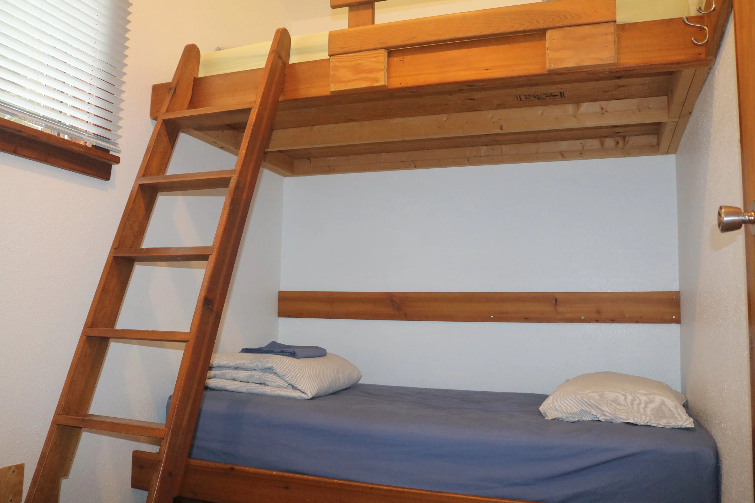 Ideal for larger families or groups, Cabin #2 comfortably sleeps up to 5 guests with one double bed and 3 twin beds. Enjoy the convenience of a private bathroom with a shower, a dining table for four, and a covered porch perfect for relaxing after a day outdoors. With plenty of room to spread out, this cabin is your home base for fun, connection, and lakeside memories.